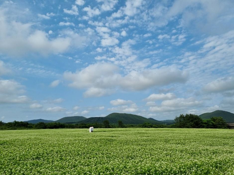 5월 말에서 6월 초 사이 만개한 메밀꽃이 보롬왓 전역에 흐드러지게 피어 있어, 제주도의 자연과 함께 사진 찍기 좋은 명소로 추천됩니다.