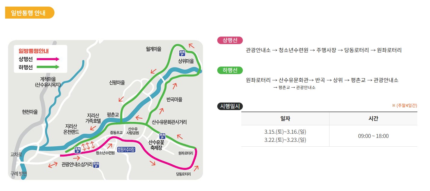 - 주요 행사: 개막 축하 공연, 산수유 꽃길 트레킹, 전통 체험, 포토존 운영, 야간 조명