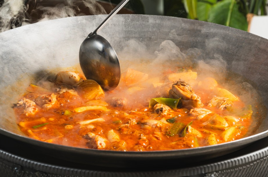 넓은 솥뚜껑에 끓여내는 닭볶음탕은 시각적으로도 압도적이다.